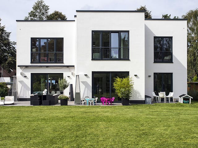Dieses großzügig bemessene Bauhaus schafft auch genug Raum für eine mehrköpfige Familie. Schlichte Eleganz verbindet sich mit einem repräsentativen Eingang und lichtdurchfluteten Räumen.