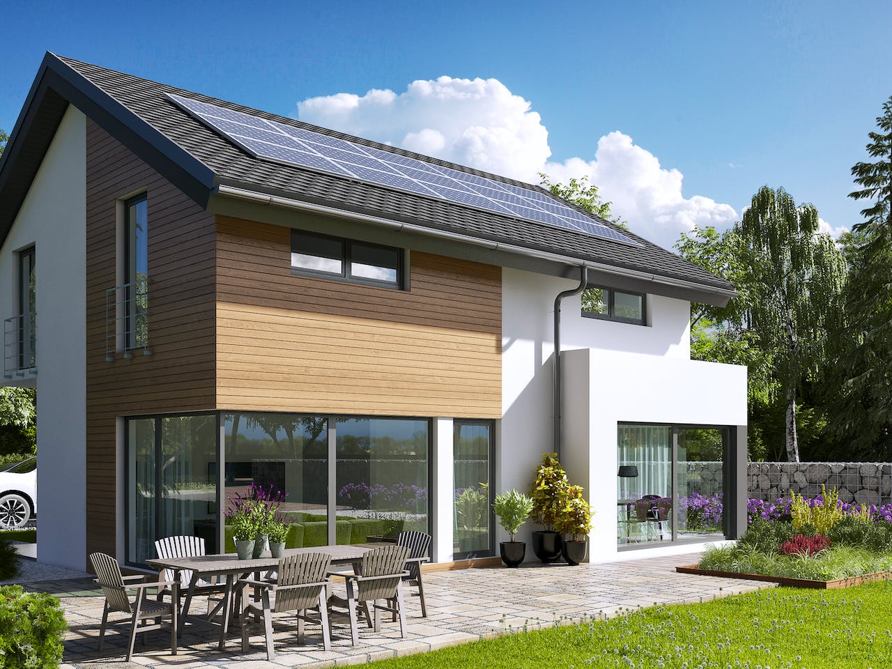 Im Erdgeschoss dominiert der helle, freundliche und offen gestaltete Wohn-, Ess- und Kochbereich, der sich ideal als zentraler Familientreffpunkt eignet. Der direkte Zugang zur Terrasse lädt zum entspannten Frühstück im Freien oder gemütlichen Grillabenden mit Freunden ein. Bodentiefe Fenster verleihen den Räumen im Erdgeschoss Großzügigkeit und ein einladendes Ambiente. So lichtdurchflutet wie der Wohnbereich, sind auch die Räume im Dachgeschoss. Das modern-charmante Fertighaus verfügt über eine Gesamtwohnfläche von 150,47 m2 und überzeugt mit einer intelligenten Raumaufteilung.