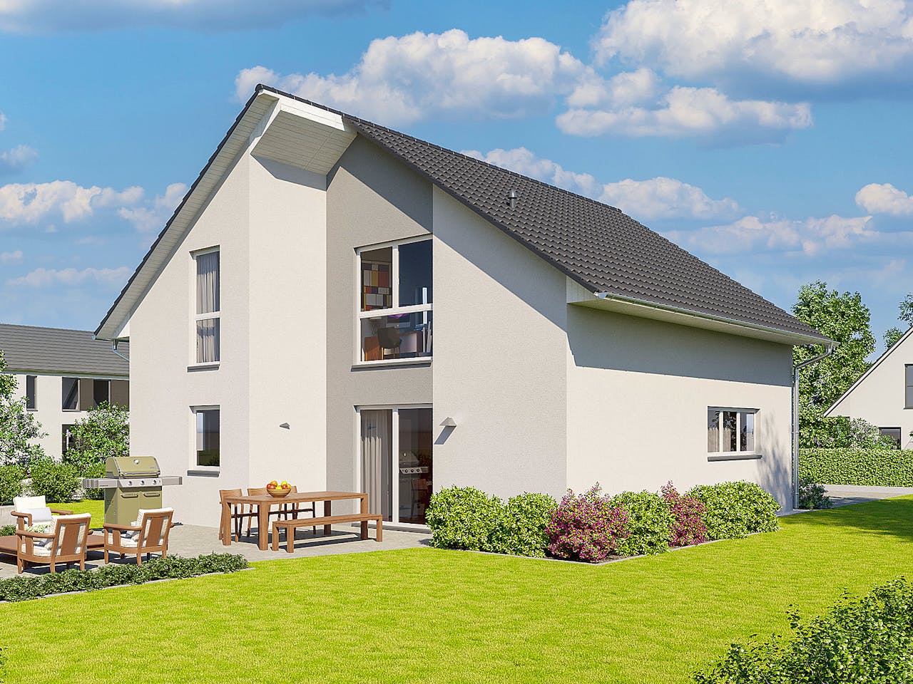 Das Einfamilienhaus Ammersee besticht durch seine moderne Satteldachvariante und versetzte Baukörper, die einen besonderen architektonischen Reiz bieten. Diese Gestaltung ermöglicht es, eine Terrasse im Halbschatten zu planen – ideal für entspannte Stunden im Freien. Der offene Wohn- und Essbereich im Erdgeschoss lädt zu geselligen Abenden und entspannten Momenten ein, während die großzügige Küche perfekt für gemeinsame Kochabende geeignet ist. Optional kann ein zusätzliches Arbeitszimmer im Erdgeschoss integriert werden. Im Dachgeschoss erwarten Sie d weitere Zimmer, darunter ein geräumiges Schlafzimmer und ein Badezimmer mit Dachfenster. Die versetzten Baukörper verleihen jedem Raum eine individuelle Note und bieten viel Spielraum für persönliche Gestaltung.