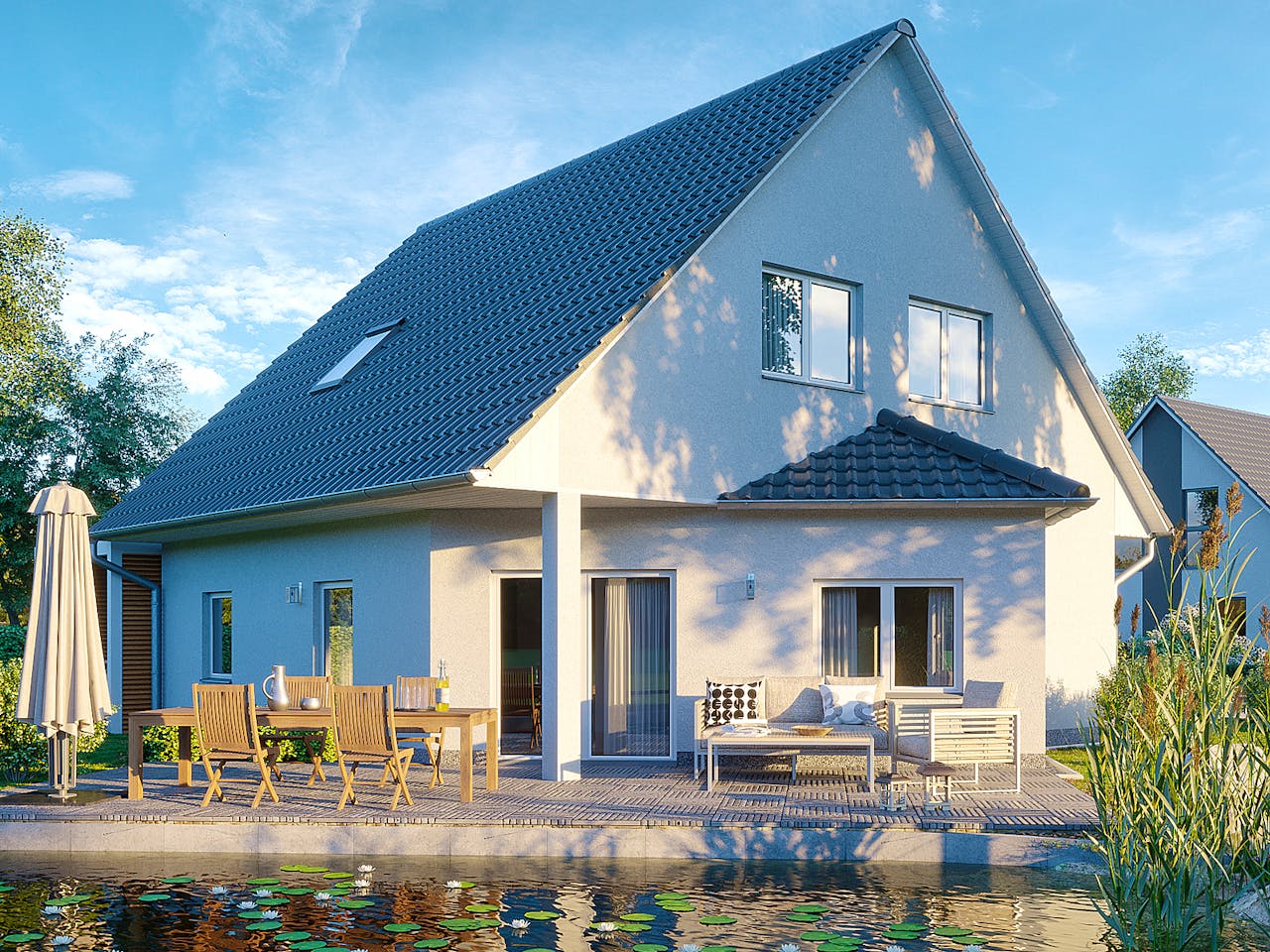 Das Einfamilienhaus Edersee besticht durch einen besonders reizvollen Baustil, der mit seinem markanten dreieckigen Erker sofort ins Auge fällt. Dieser außergewöhnliche Erker verleiht dem Haus nicht nur eine einzigartige Silhouette, sondern sorgt auch für viel Licht und eine besonders einladende Atmosphäre. Optional kann das Haus auch mit einem Balkon erweitert werden, der zusätzlichen Raum für Entspannung im Freien bietet. Im Erdgeschoss erwartet Sie ein direkter Zugang vom Flur in die großzügige Küche, die nahtlos in einen großen Essbereich übergeht – ideal für gesellige Mahlzeiten mit der Familie oder Freunden. Im Dachgeschoss finden Sie zwei individuell nutzbare Räume, die Raum für Ihre persönlichen Bedürfnisse bieten – sei es als Arbeitszimmer, Kinderzimmer oder Gästezimmer. Das Schlafzimmer bietet den perfekten Rückzugsort, während das geräumige Badezimmer zum Entspannen und Wohlfühlen einlädt. Das Einfamilienhaus Edersee bietet Ihnen alles, was Sie für ein modernes, komfortables Zuhause benötigen.