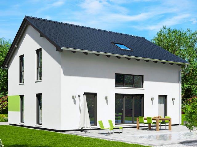 Der Hausentwurf Wien ist wie gemacht für Bauherren, welche Wert auf einen geräumigen und durchdachten Grundriss legen. Herzstück des Hauses ist der große Wohn- und Essbereich, welcher durch einen direkten Zugang mit der großzügig geplanten Küche verbunden ist. In der Küche wurden nicht nur alle Notwendigkeiten wurden hier eingeplant. Zusätzlich ist hier Platz für eine Theke. Außerdem ist im Erdgeschoss Platz für ein Gäste-WC und einen Hauswirtschaftsraum mit integrierter Abstellkammer. Im Dachgeschoss wurde ein Arbeitszimmer und ein Kinderzimmer neben dem großen Badezimmer und dem Schlafzimmer mit anschließender praktischen Ankleide, eingeplant. Die offene Galerie sorgt in der Galerie für ein offenes Wohngefühl und viel natürliches Licht.