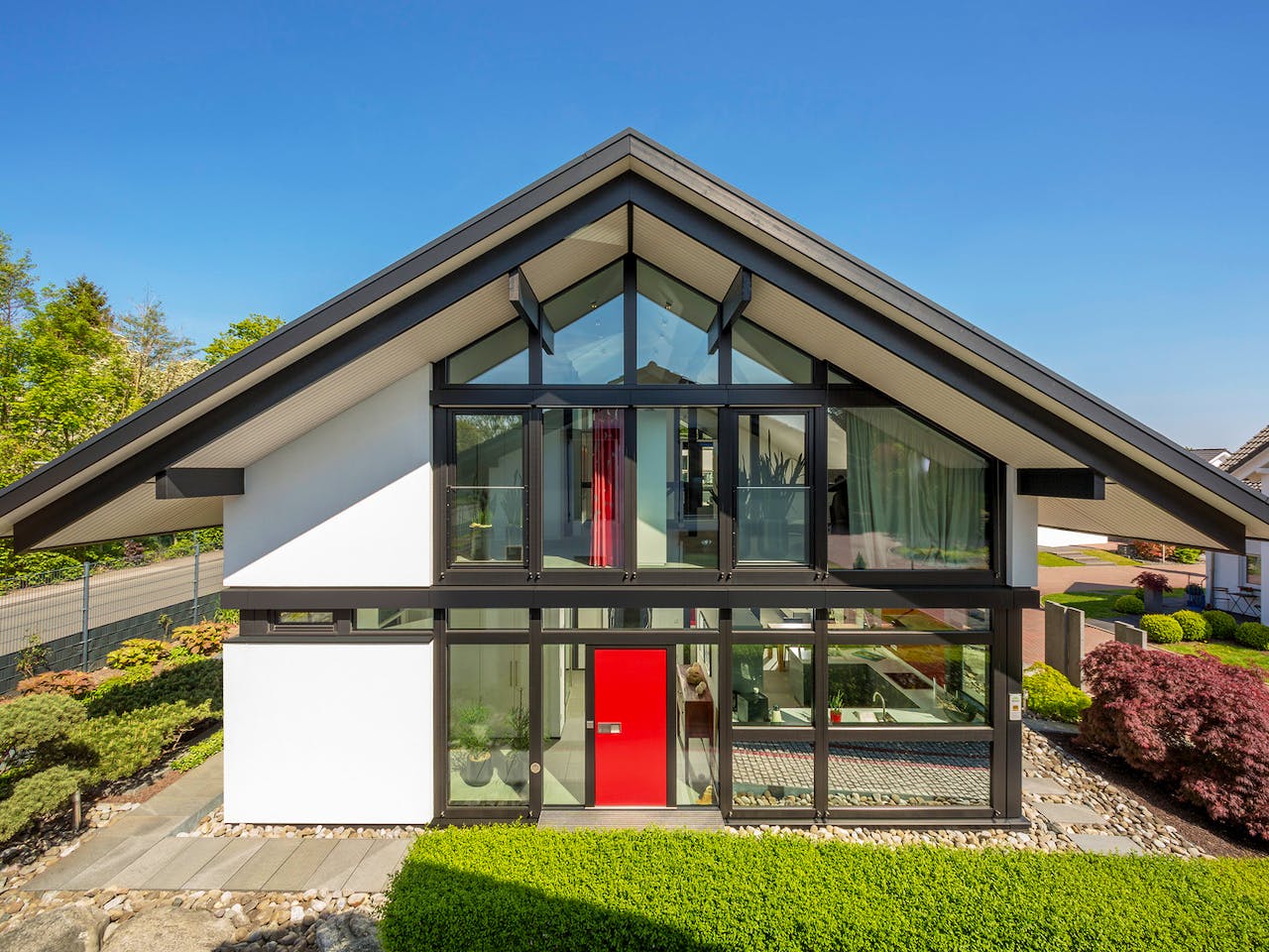 In diesem HUF Haus MODUM ergänzen sich äußere und innere Werte: Die raffinierte Fachwerkkonstruktion verbindet Glasflächen und individuell platzierte Sichtschutzelemente zu einer ästhetischen Einheit und schafft eine entspannte Wohnatmosphäre auf zwei Ebenen. Ein besonderes Merkmal dieses Hauses ist die energieeffiziente Ausstattung mit seinem 30°-Satteldach: Die Photovoltaikanlage liefert eine Leistung von 10,71 kWp und wird ergänzt durch eine Luft-Wasser-Wärmepumpe. Somit produziert das für Familien perfekt geeignete HUF Haus mehr Strom aus erneuerbaren Energiequellen, als für den eigenen Betrieb gebraucht wird. Licht und Jalousien lassen sich durch das KNX-System komfortabel steuern.