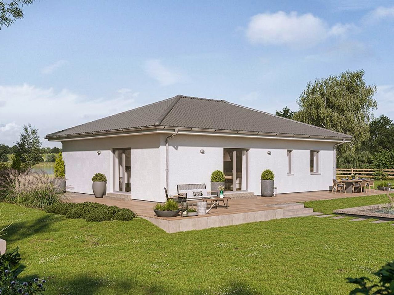 Der Bungalow FamilyStyle 11.01 W ist mit einer Nettogrundfläche von rund 113 m² ein echtes Raumwunder und bietet Platz für zwei getrennte Wohneinheiten. Jede dieser Einheiten bietet Platz für einen offen gestalteten Wohn-, Ess- und Kochbereich, ein Schlafzimmer und ein Badezimmer. Informieren Sie sich jetzt und fordern Sie unser kostenloses Infopaket an.