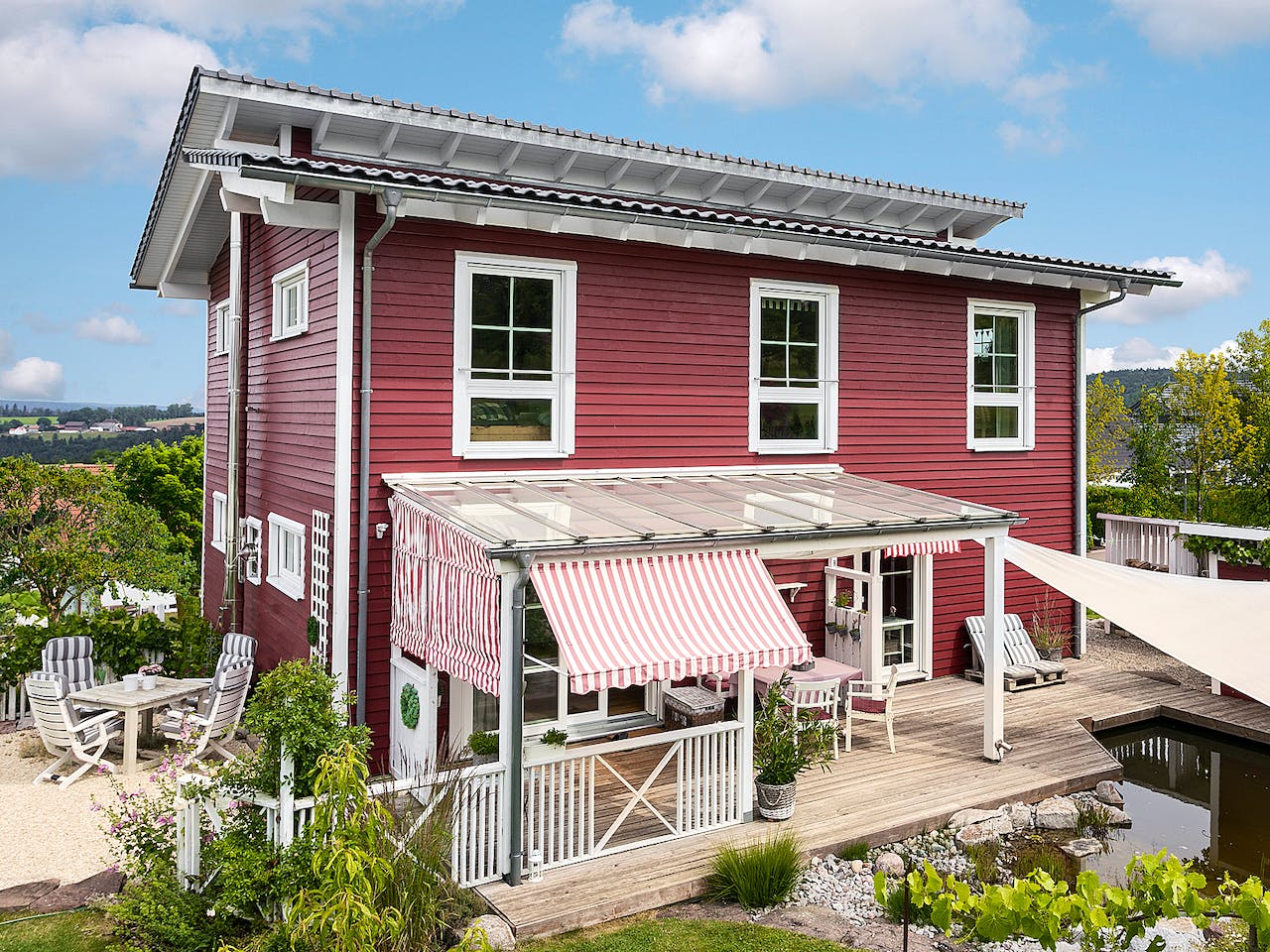 Die rotbraune Holzfassade mit den weiß abgesetzten Sprossenfenstern, der Natur-Gartenteich, die Holzterrasse, die gestreiften Markisen und Sonnenliegen – das Haus von Familie Leißner könnte auch einen schwedischen See säumen. Urlaubsambiente verbreitet es allemal. Und es erzeugt einen Hauch von Sehnsucht nach unbeschwerten Kindertagen.