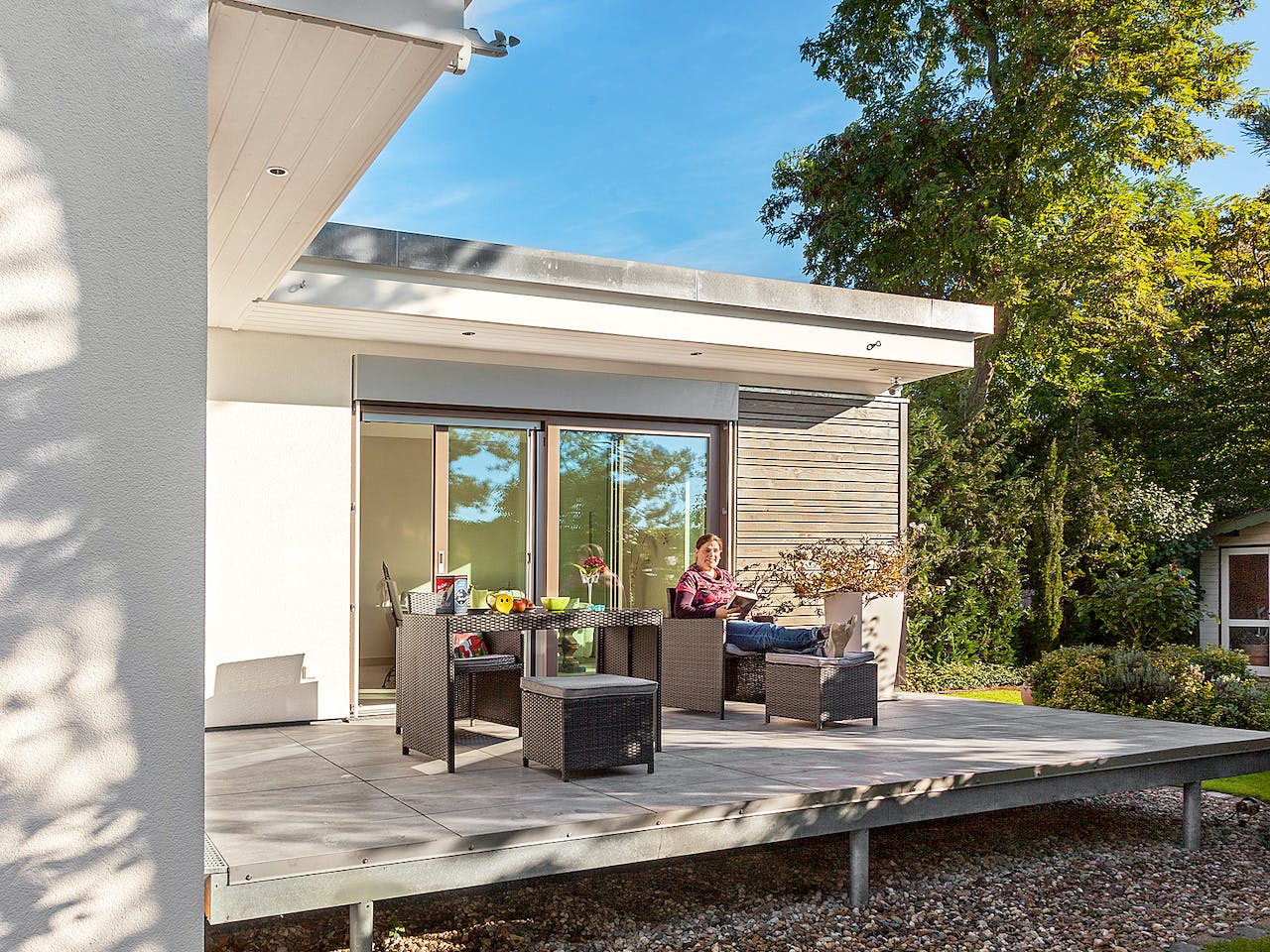 Janine Wagner bekam durch die Platzierung von zwei FlyingSpace-Modulen über Eck einen attraktiven Winkelbungalow mit windgeschützter Terrasse in direkter Nachbarschaft zu ihren Eltern. Der Grundriss entspricht einer kompakten 3,5-Zimmer-Wohnung mit offener Küche und Duschbad. Raumhohe Einbauschränke schaffen viel Stauraum. Der Vorteil: alle Räume können natürlich belichtet werden.