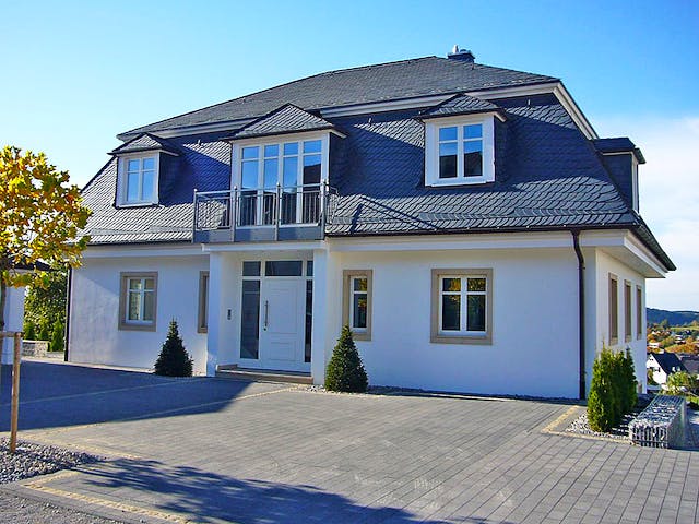 Verteilt über drei Etagen bietet dieses Wohnhaus in Holzrahmenbauweise mit mehr als 200 m² Wohn- und Nutzfläche reichlich Platz für die Wohnträume des Bauherrn. Das anspruchsvolle Mansarddach bringt nicht nur zusätzlichen Wohnraum im Obergeschoss, sondern ist auch optisch ein absoluter Hingucker. Die dunkle Schieferverkleidung des Mansardgeschosses bildet einen schönen Kontrast zur hellen Putzfassade im Erdgeschoss.
