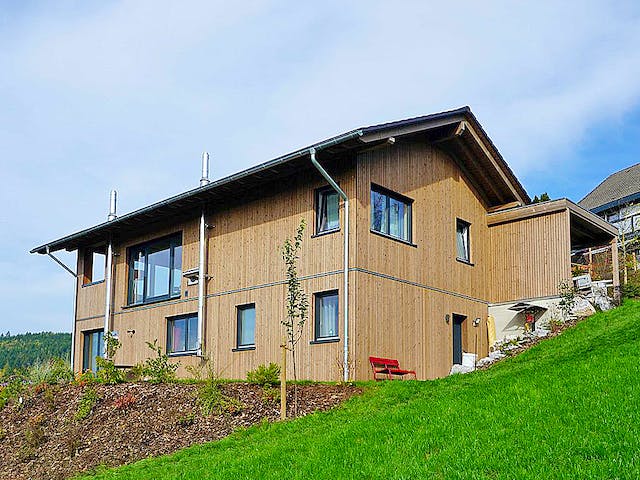 Der Wunsch der Bauherren nach einem Rückzugsort in der Natur spiegelt sich durchgängig in der Bauweise wieder. Der Naturbaustoff Holz ist rundum präsent und kam nicht nur bei der Fertigung der Holzrahmenbauwände sondern auch bei der Gestaltung der Fassade zum Einsatz. Die lotrechte Lärchenfassade im Farbton "antikgrau" verleiht dem Ferienhaus einen ganz besonderen und alpin anmutenden Flair. Vom überdachten Balkon auf der Rückseite des Gebäudes können die Bauherren eine wunderbaren Ausblick in die Landschaft genießen.