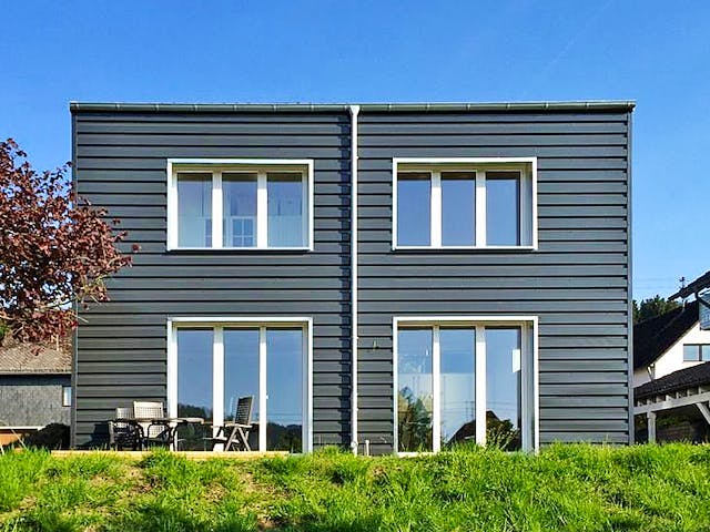 Dunkler Purismus: Die kubische Architektur, ein Baukörper aus Massivholz und die Split-Level-Bauweise bilden die elementaren Eigenschaften des Wohnhauses und verleihen ihm seinen ganz eigenen Charakter - ein absolut modernes und zeitgemäßes Zuhause.