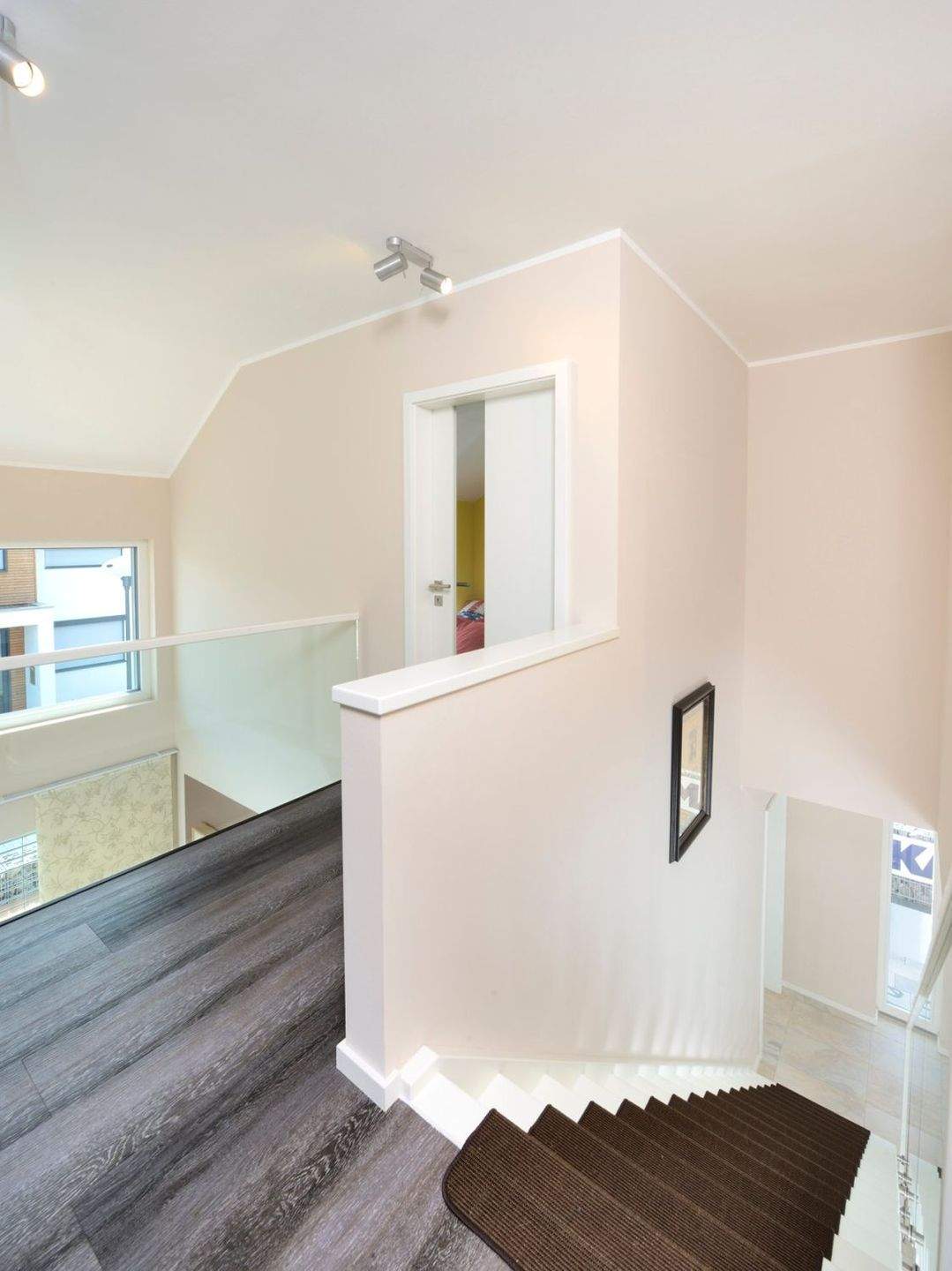 Der mannshohe Kniestock schafft ein deutliches Plus an Raum. Ansätze von Dachschrägen verleihen dem Obergeschoss einen besonderen Charme. Eine lichtdurchflutete Galerie verbindet den offenen Wohnbereich mit den privaten Wohntrakt und vermittelt grenzenlose Raumhöhe.